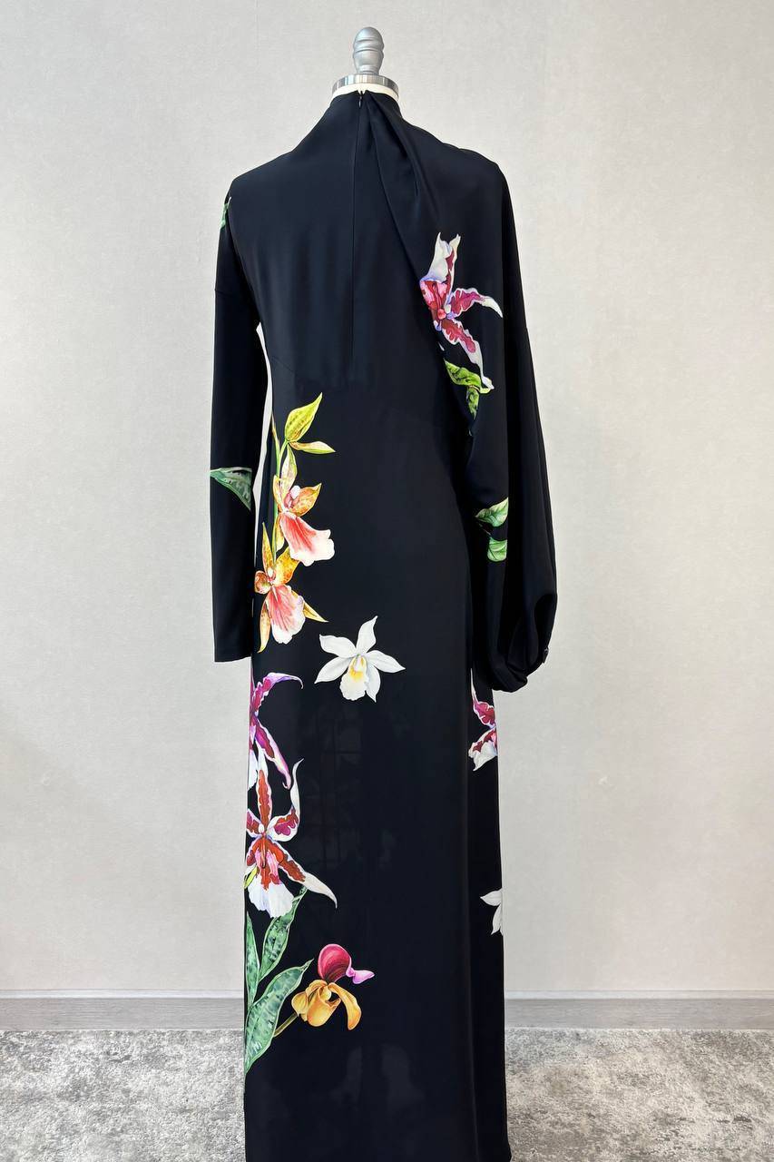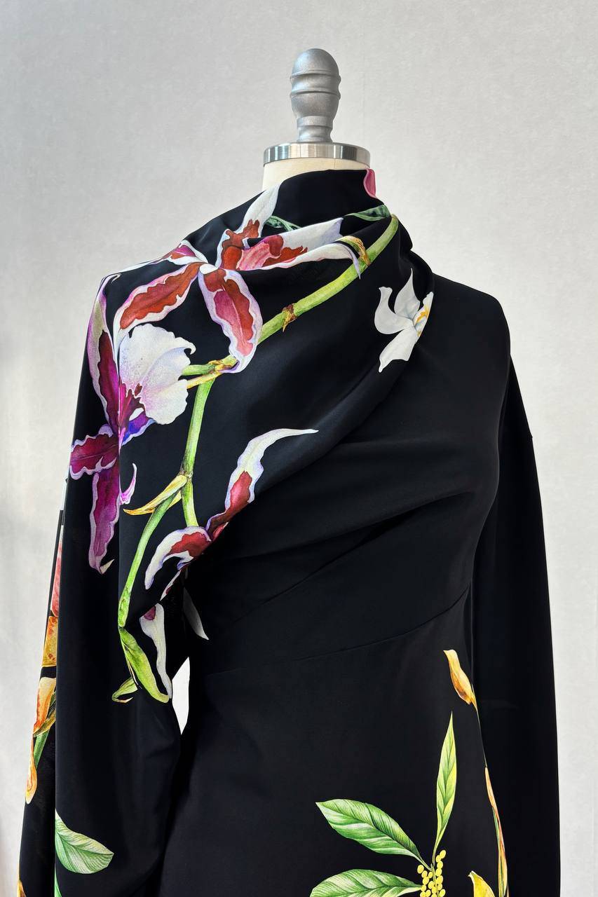 Глубокий чёрный фон становится полотном для выразительного флорального принта, а мягкий блеск крепдешина подчёркивает текучесть силуэта.