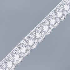 Белоснежный матовый хлопок подчеркивает каждую деталь плетения, а густые петельки «пико» по нижнему фестончатому краю создают эффект ручной работы.