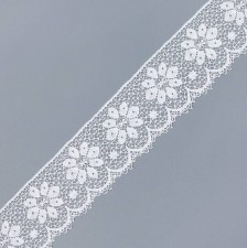 Узор — ритмичный ряд крупных цветов-ромашек, соединённых между собой легкой, воздушной сеткой, придающей тесьме изящество.
