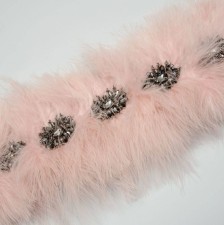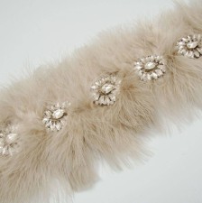 Тесьма черного цвета из перьев марабу на тонкой сетчатой основе. В качестве декора использованы серые кристаллы, стеклярус и бусины, выложенные в виде цветков. Ширина тесьмы – 15 см. Аналоги – 68840, 68842, 68843.
