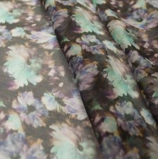 Легкий шелковый шелковый шифон с эффектом креширования графитового цвета с принтом в виде немного размытых желто-зеленых цветов.