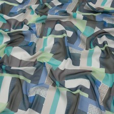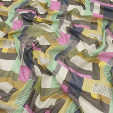 Жоржет из 100% шелка с геометрическим принтом: основные цвета узора – сиреневый, голубой, коричневый и серый