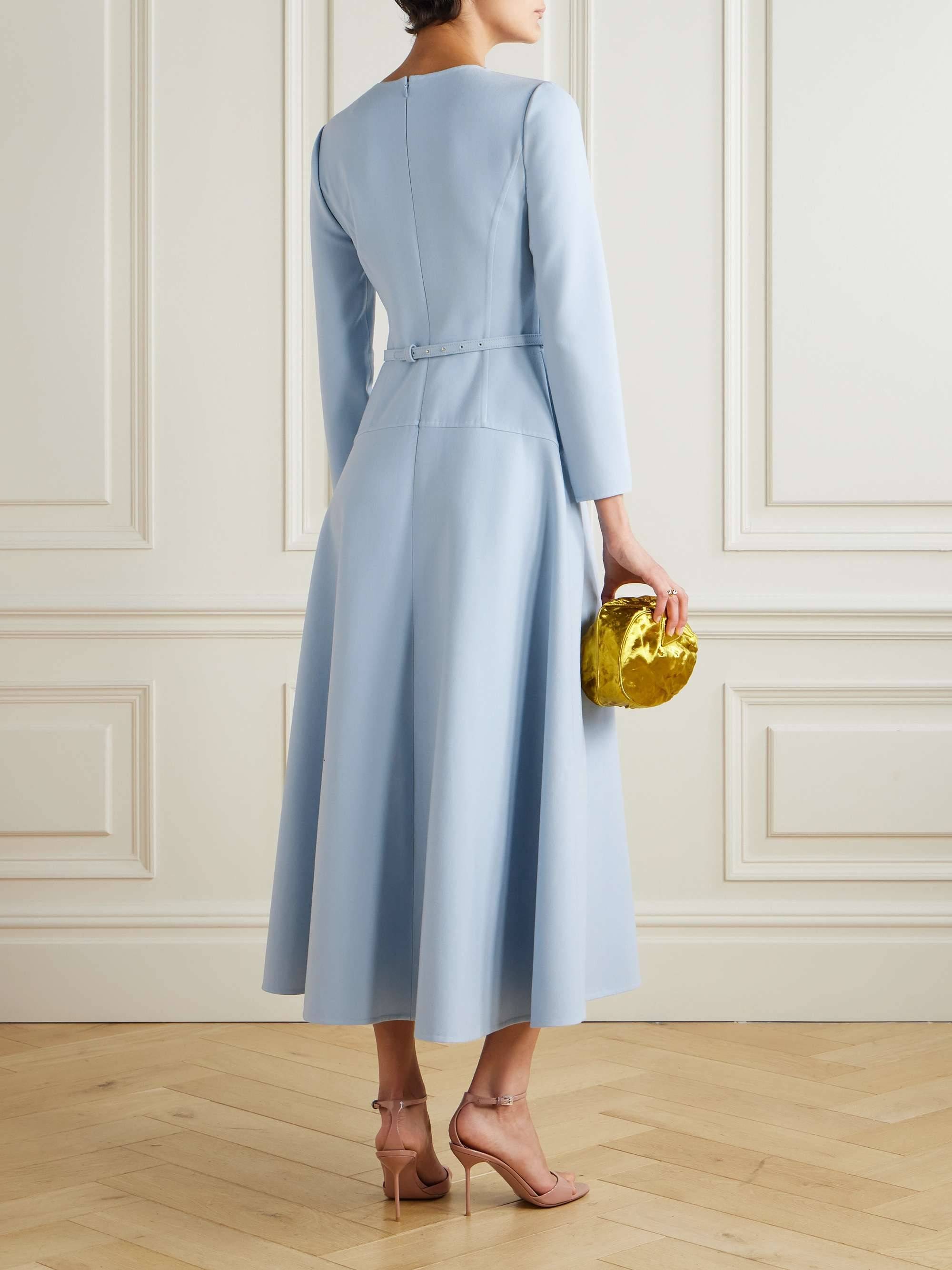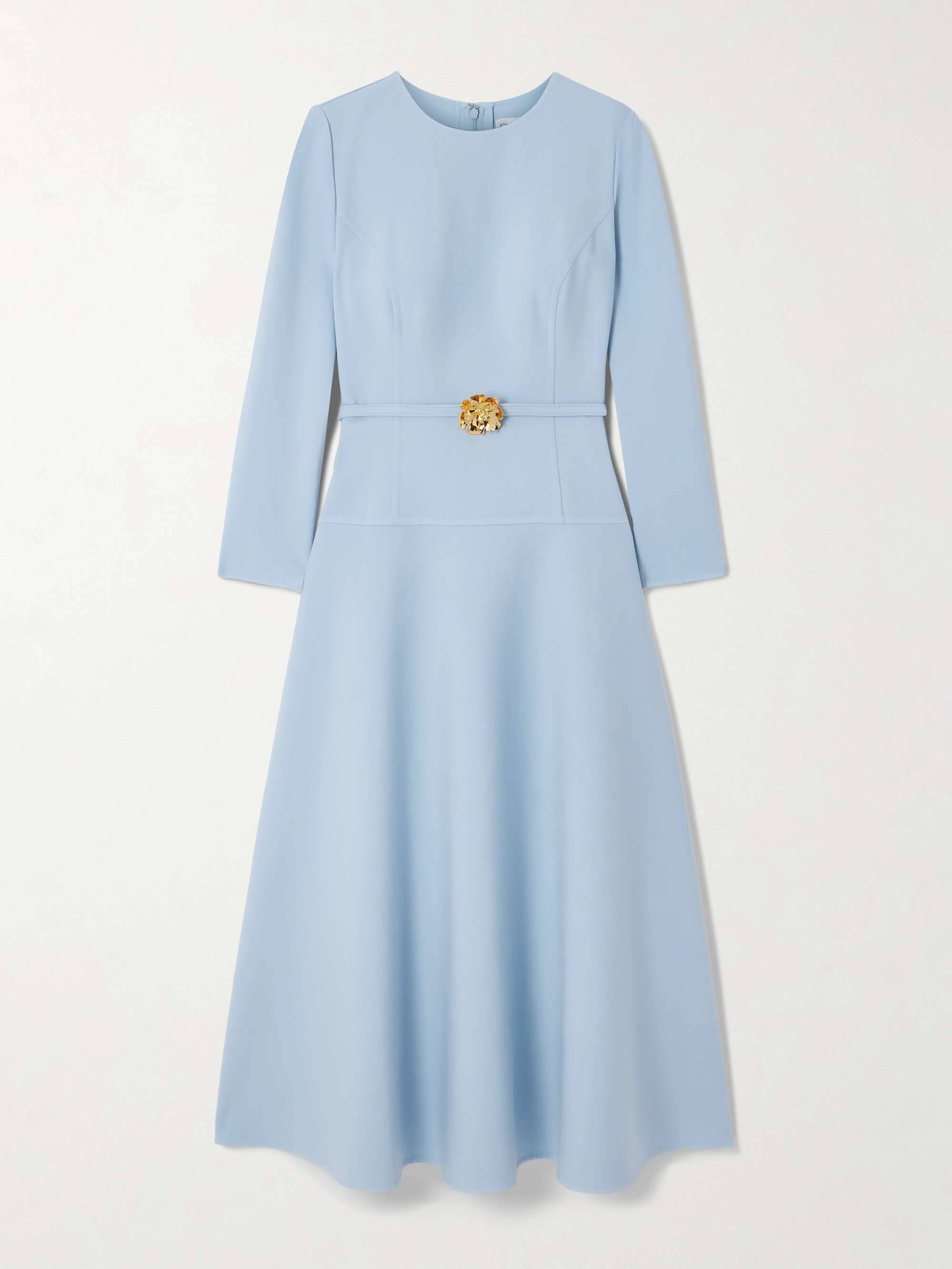 Платье миди от Oscar de la Renta излучает сдержанную элегантность. Оно выполнено из костюмной ткани из мериносовой шерсти с добавлением эластана. Пряжка золотистого цвета выполнена в форме распустившегося пиона.